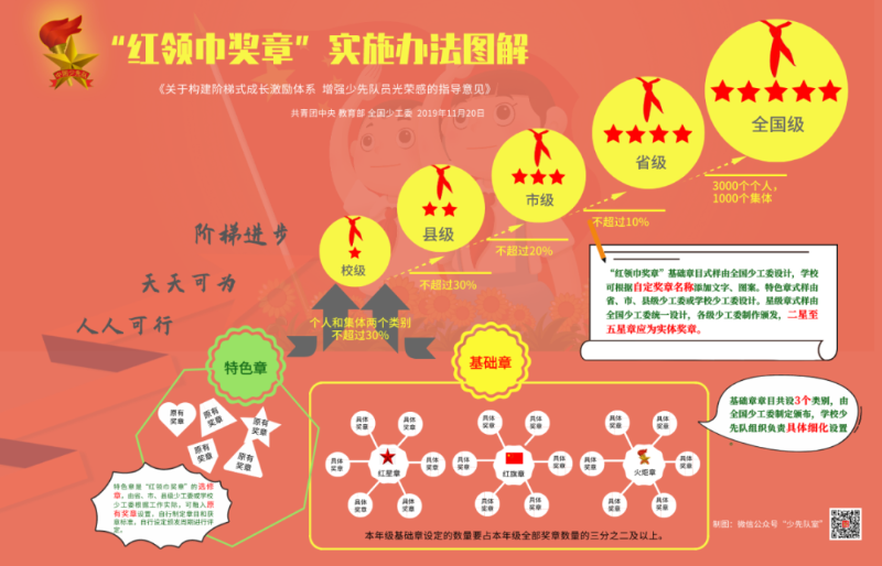 2019年,共青团中央、教育部、全国少工委联合下发《关于构建阶梯式成长激励体系增强少先队员光荣感的指导意见》,“红领巾奖章”是其中“少先队员阶梯式成长激励评价体系”的核心载体。